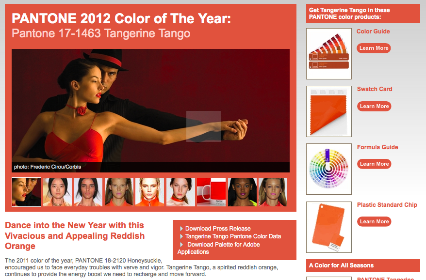 El Instituto del Color Pantone ha designado este vibrante y energético tono, de un anaranjado rojizo, como el color del año 2012. El clima económico actual y las frustraciones convocan algo más audaz este año que viene. Pantone sugiere en el “espíritu de color rojizo-anaranjado” dar el impulso de la energía que necesitamos para recargar y seguir adelante.