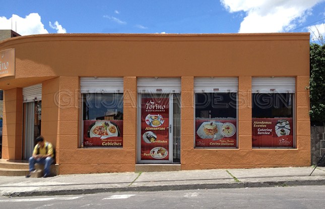 Actualmente. Viniles adhesivos y perforados, para no obstruir la luz, ni la vista desde el interior del local.